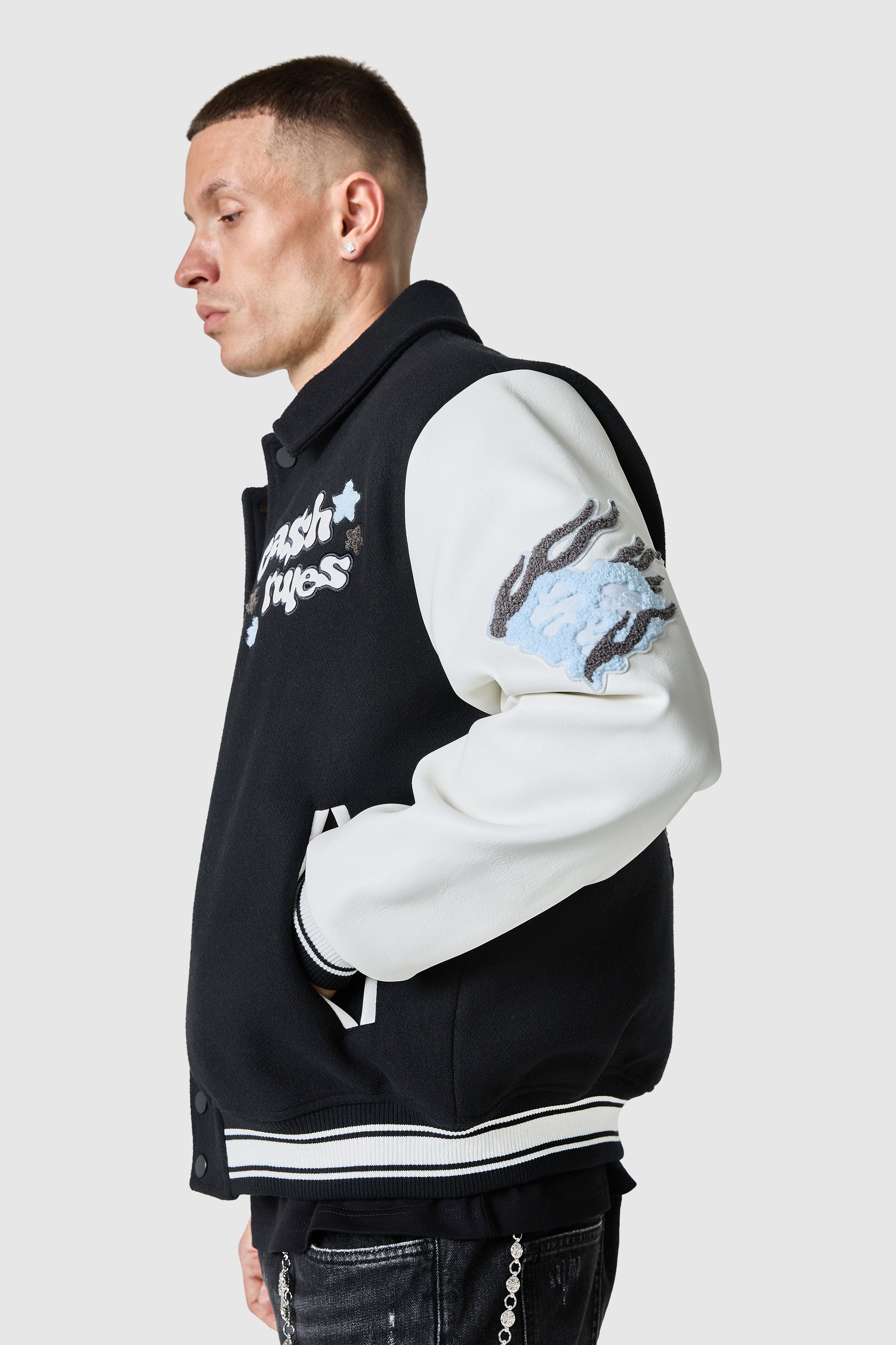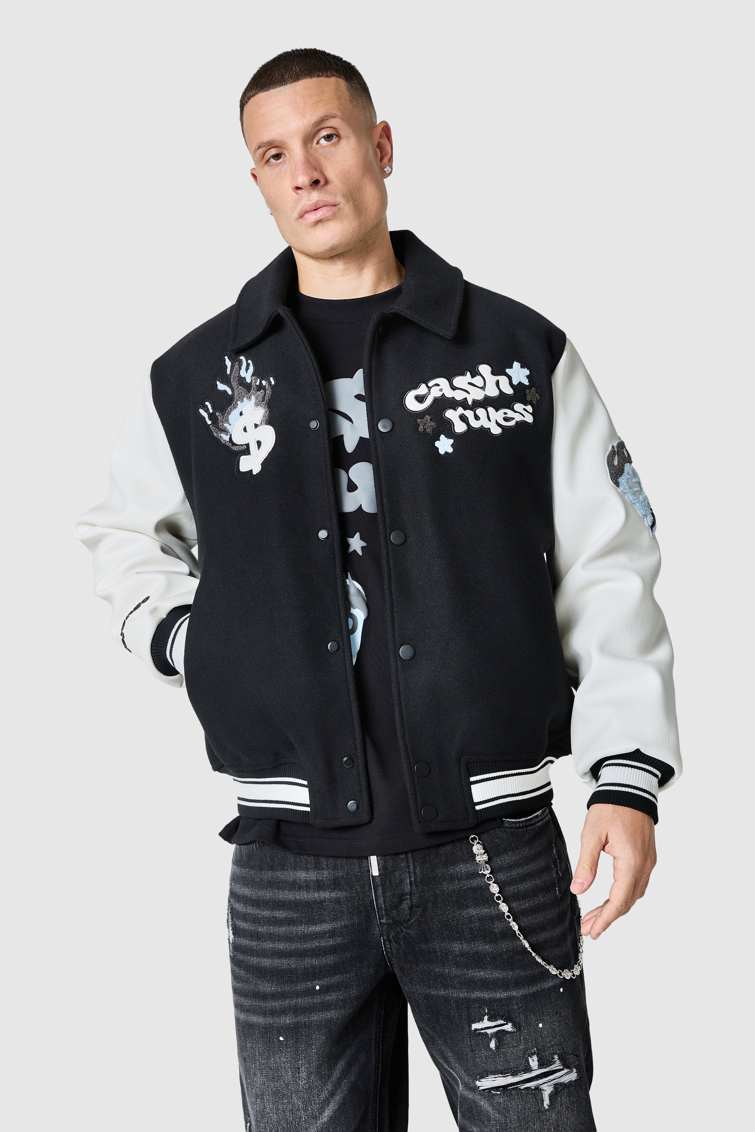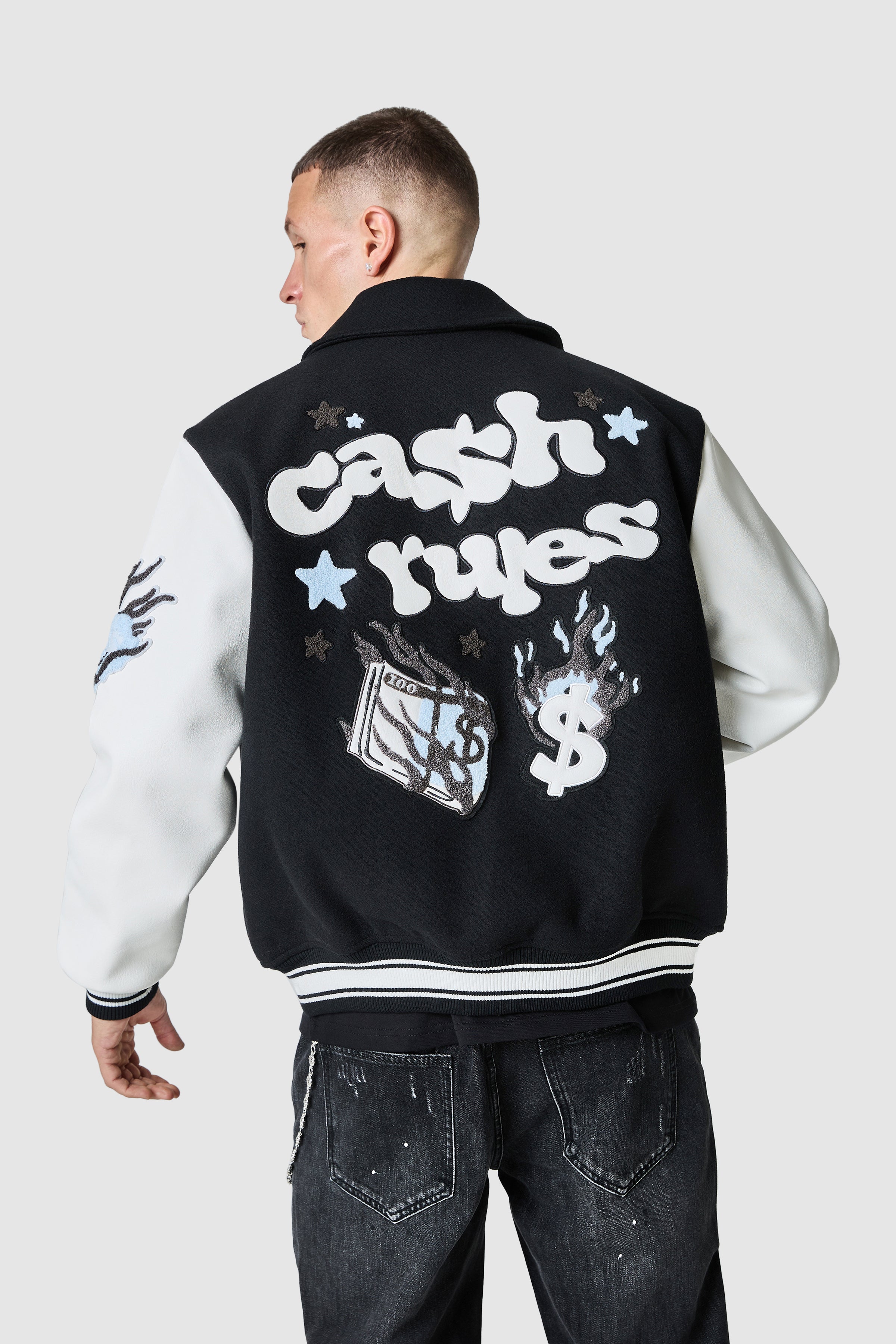 The Cash Rules Varsity Jacket features branded embroidery and applique. This jacket combines functionality and style.