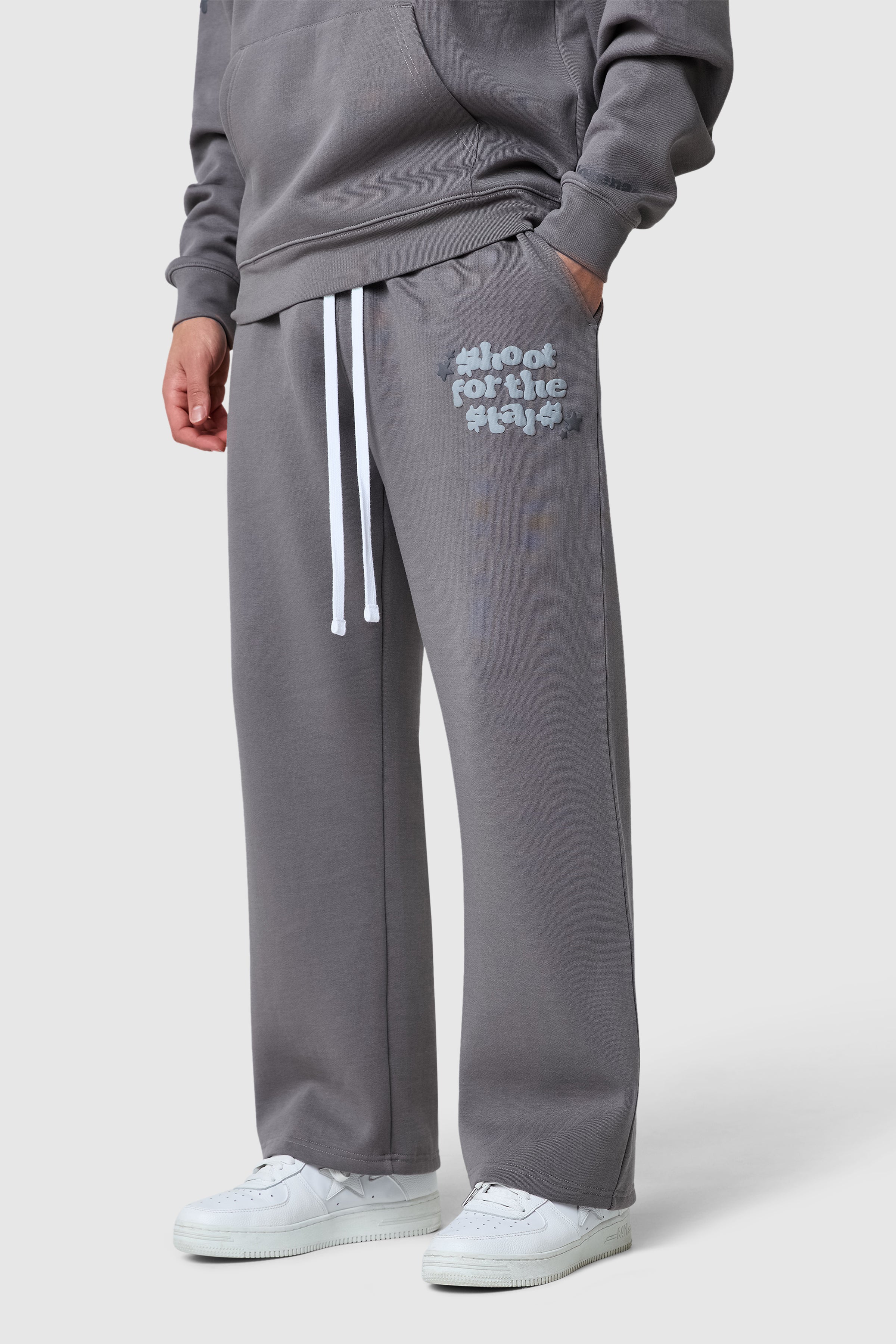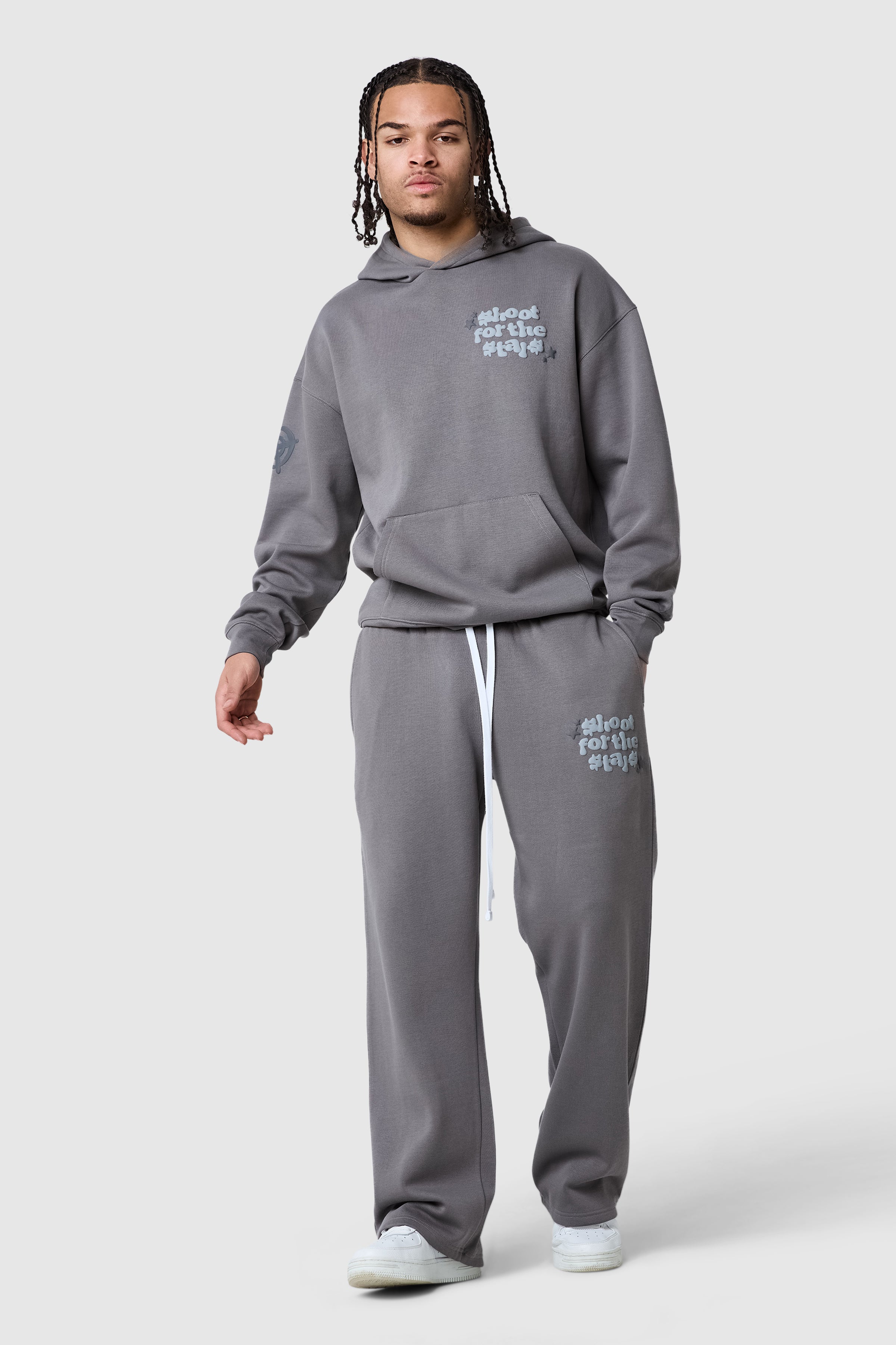 Introducing the Shoot For The Stars Tracksuit. Featuring a bold graphic puff print and ribbed cuffs and hem hood and a wide leg jogger, Shoot for the Stars is a new staple.