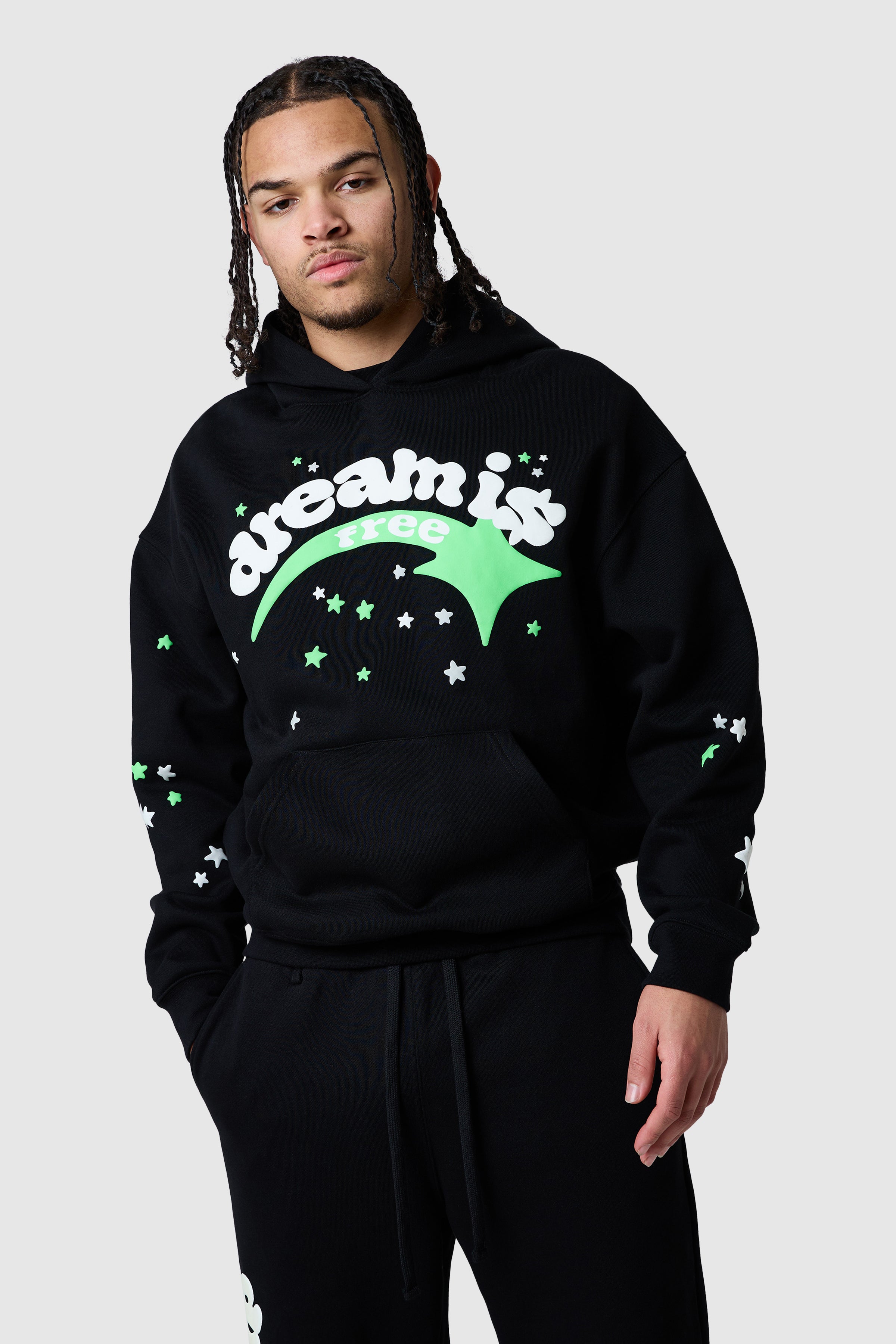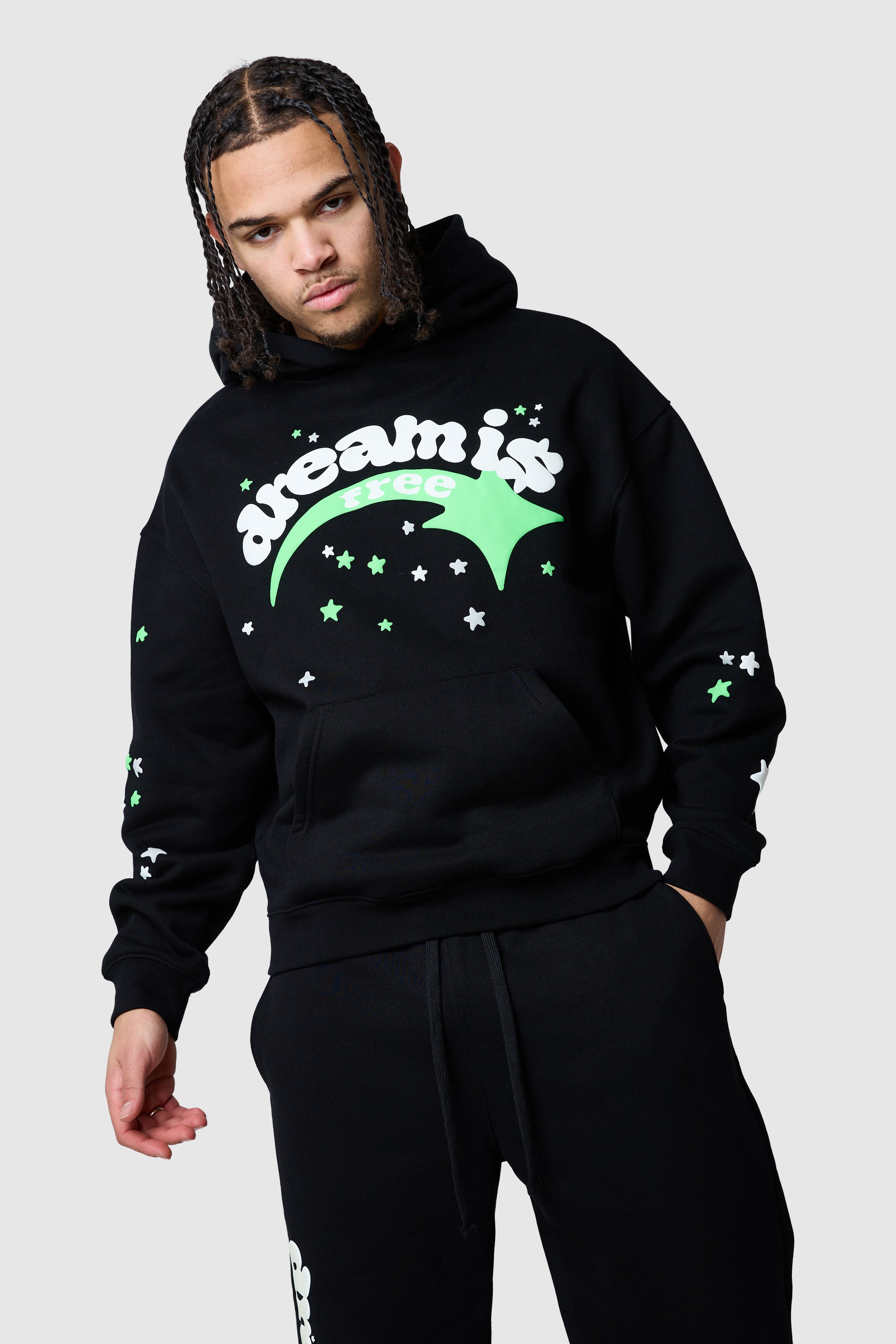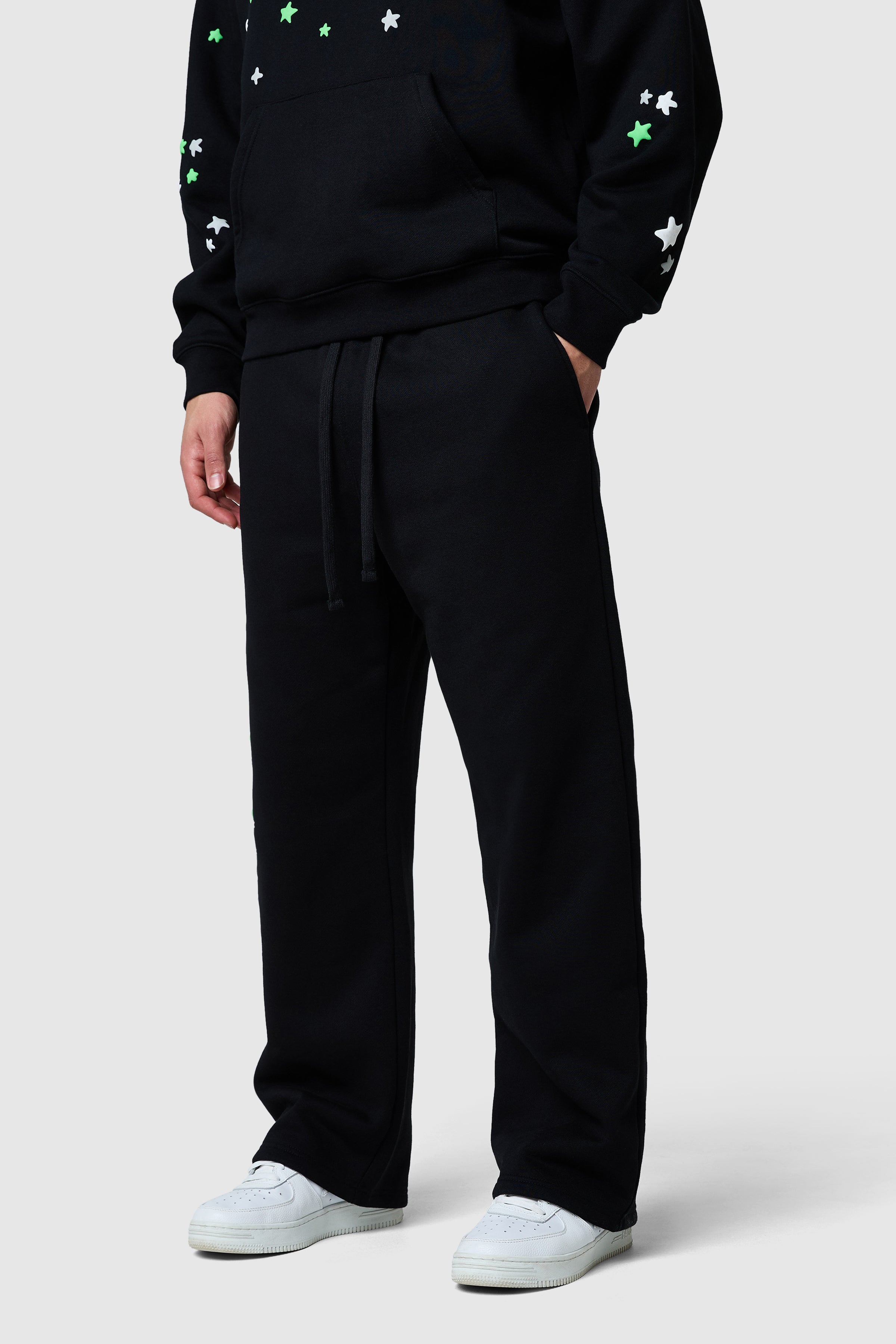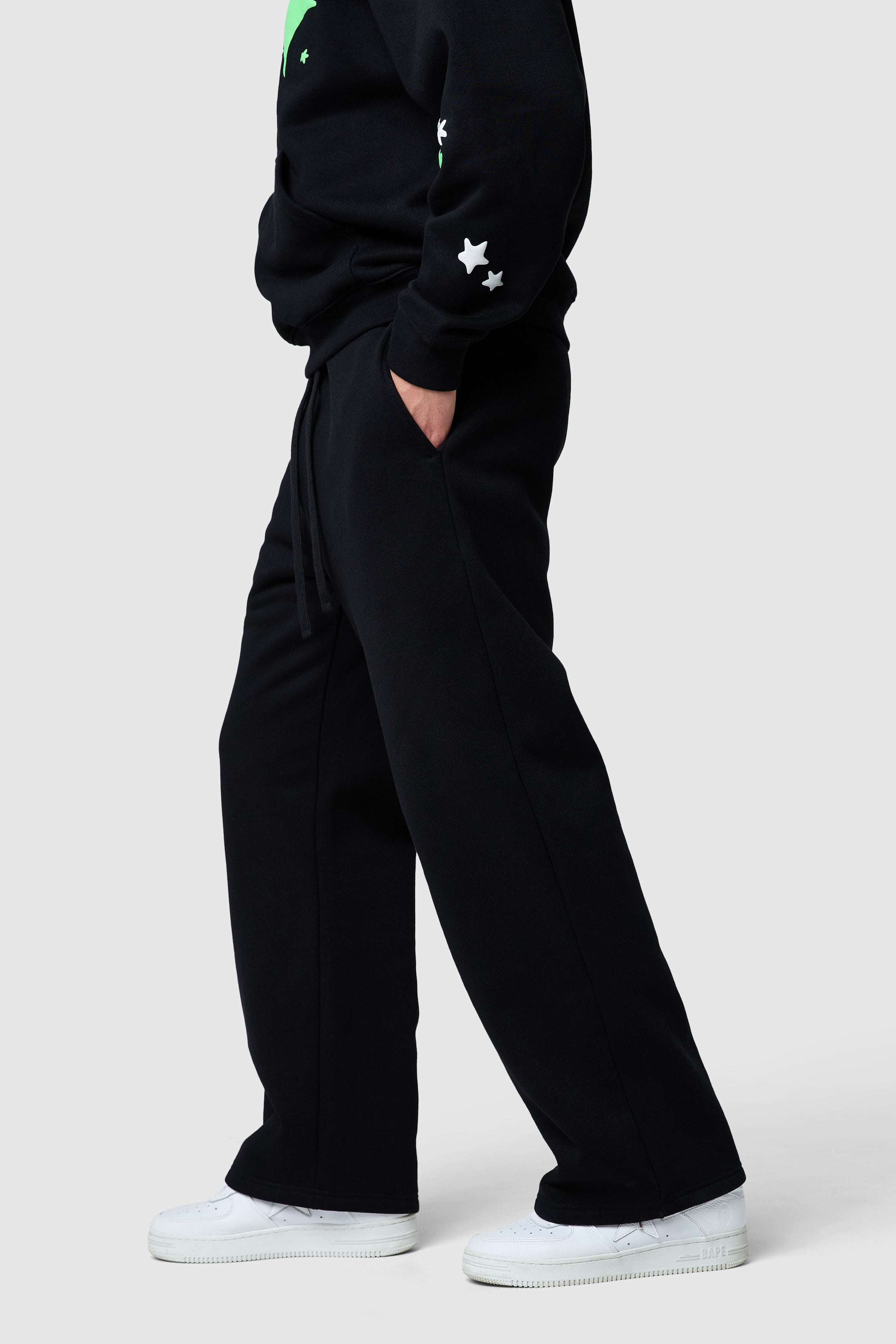 Designed for all-day comfort and bold expression, the Shooter Tracksuit features a relaxed hood and relaxed jogger silhouette. Statement, glow in the dark graphics create an easy, confident streetwear look. Style together or separately for everyday impact.