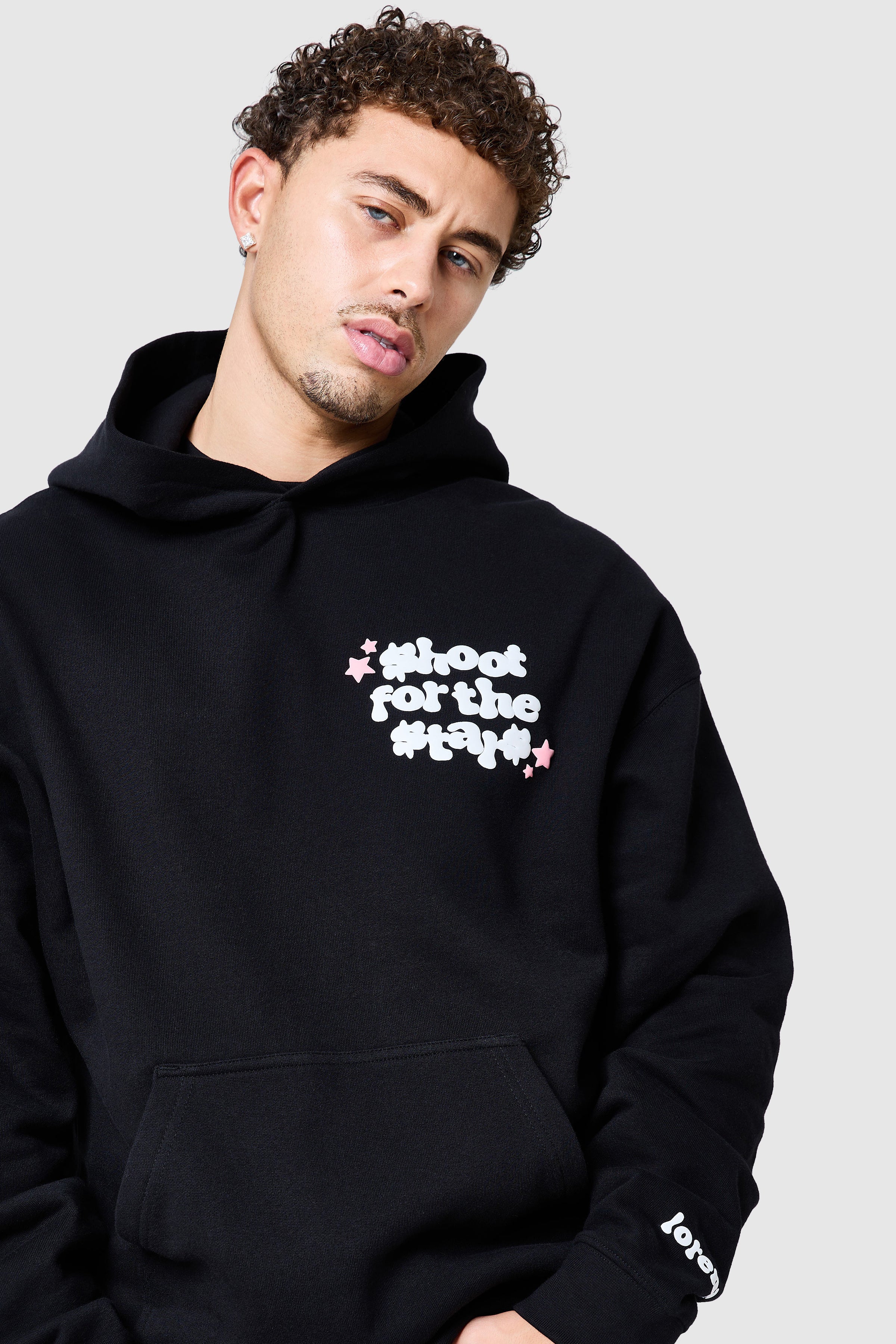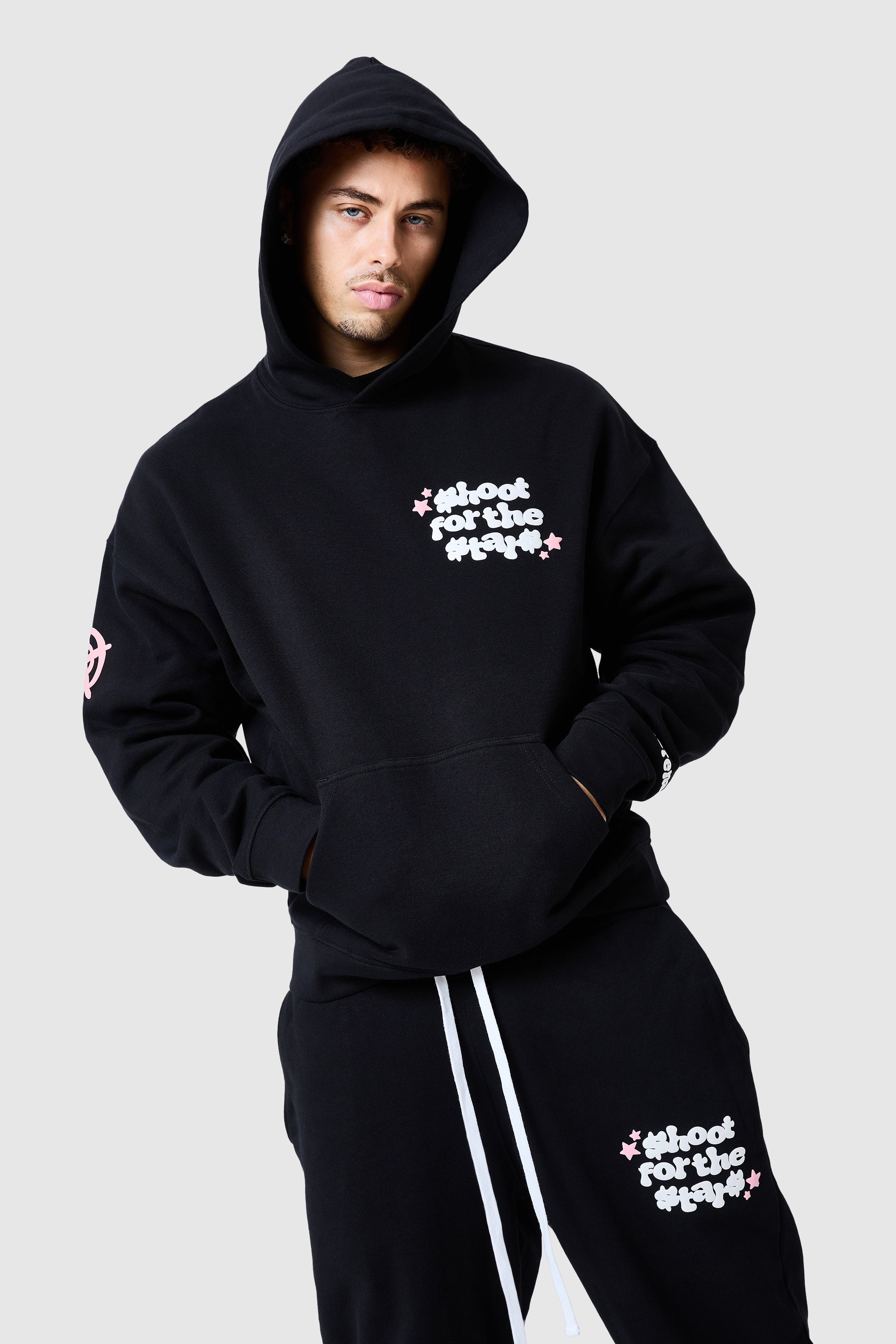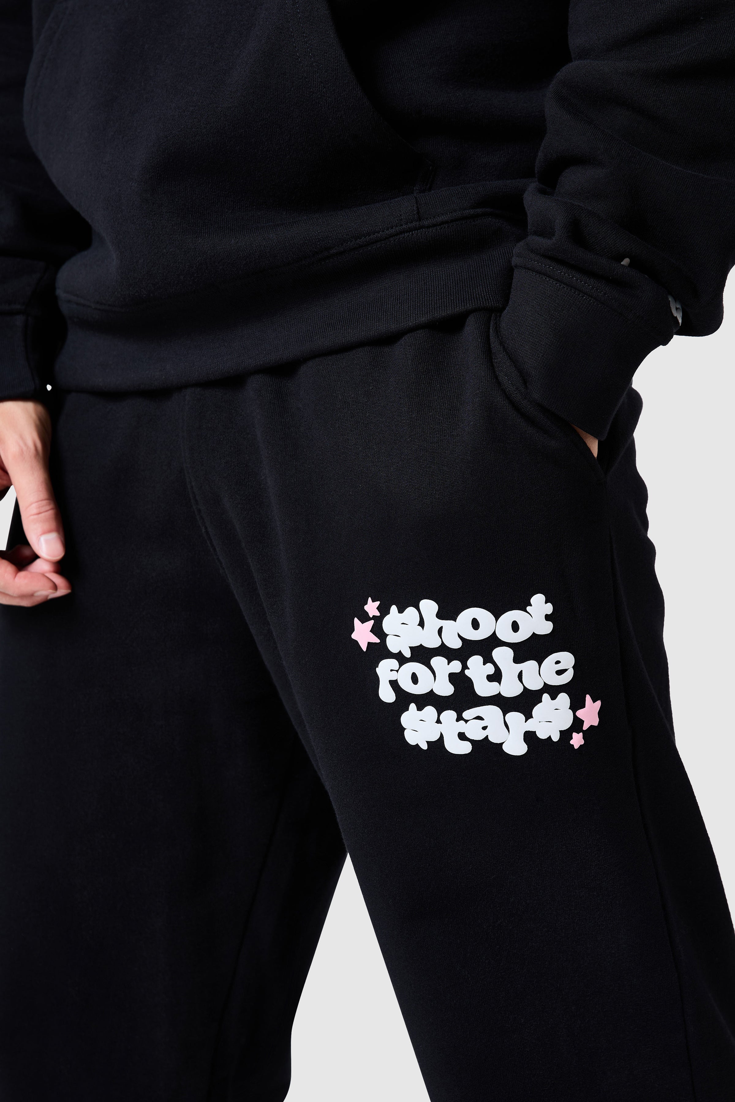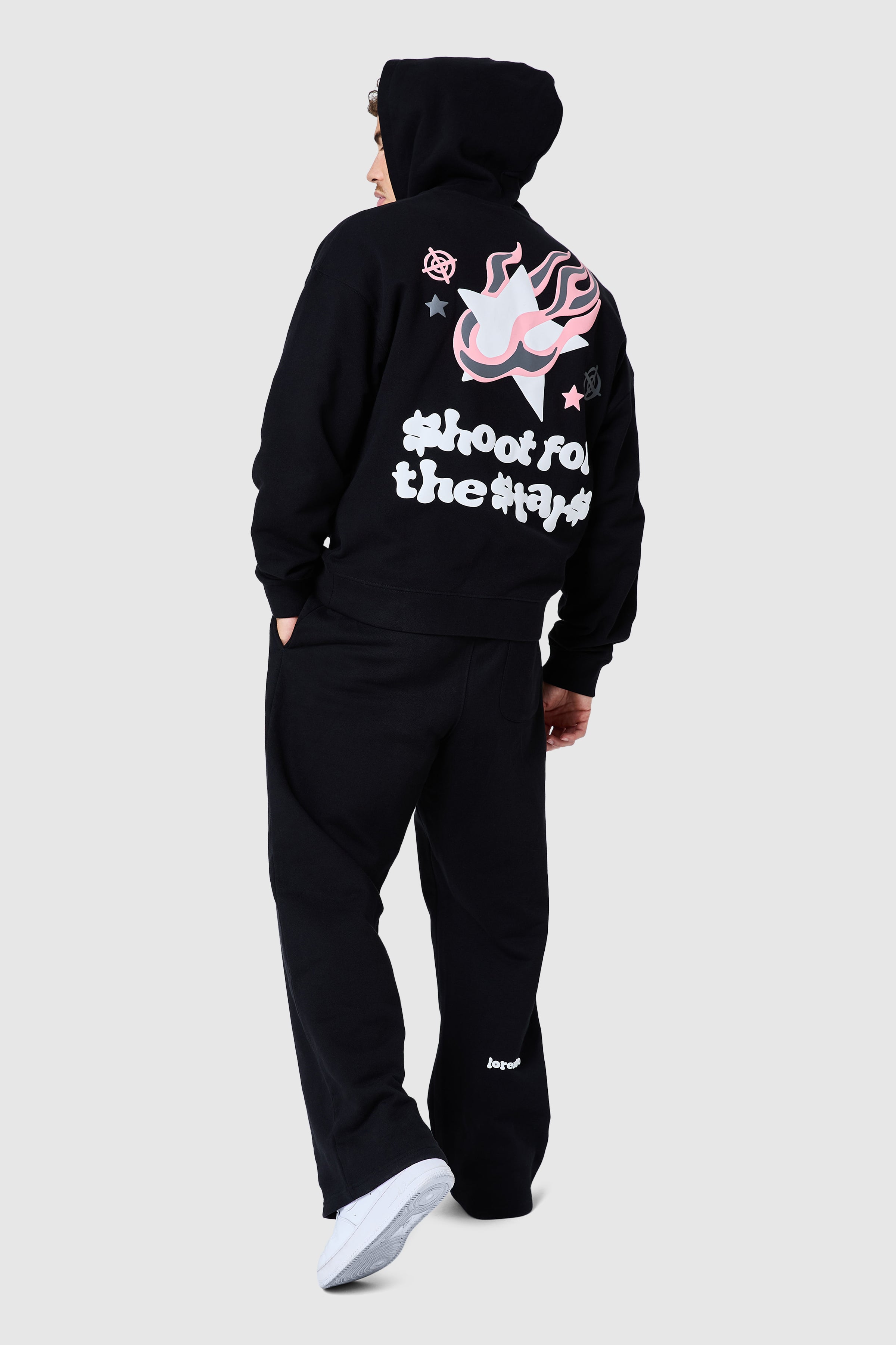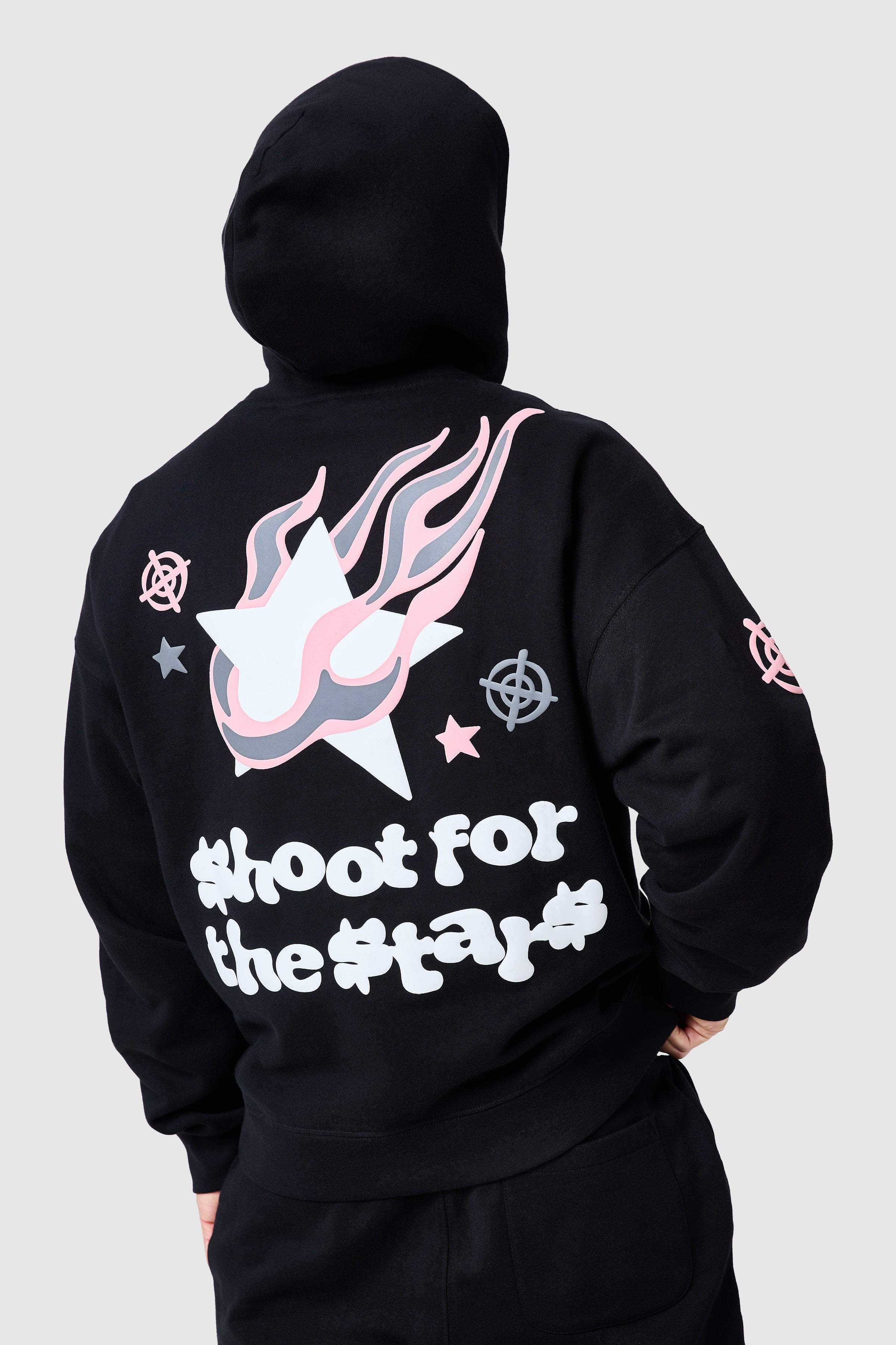 Introducing the Shoot For The Stars Tracksuit. Featuring a bold graphic puff print and ribbed cuffs and hem hood and a wide leg jogger, Shoot for the Stars is a new staple.