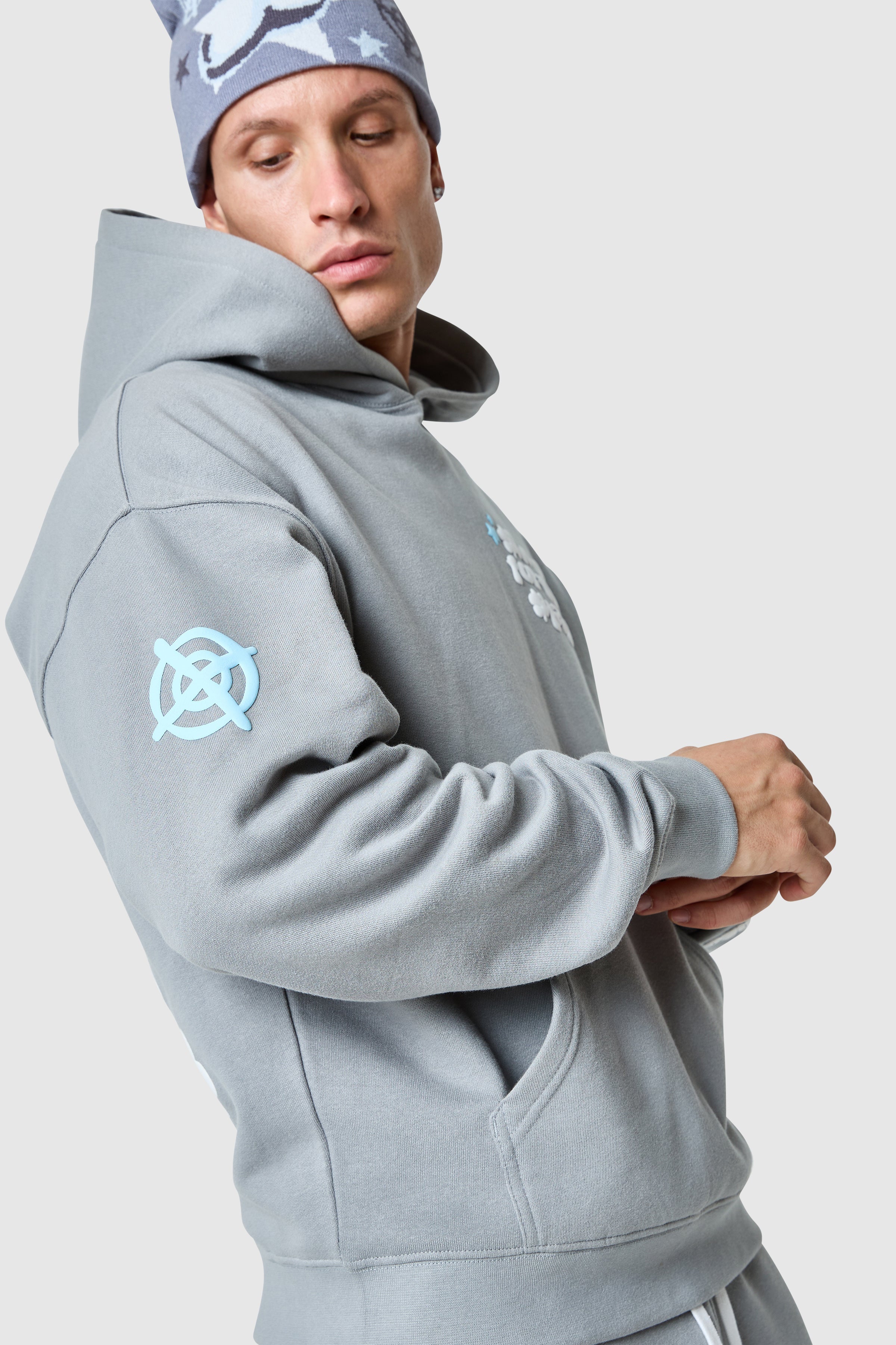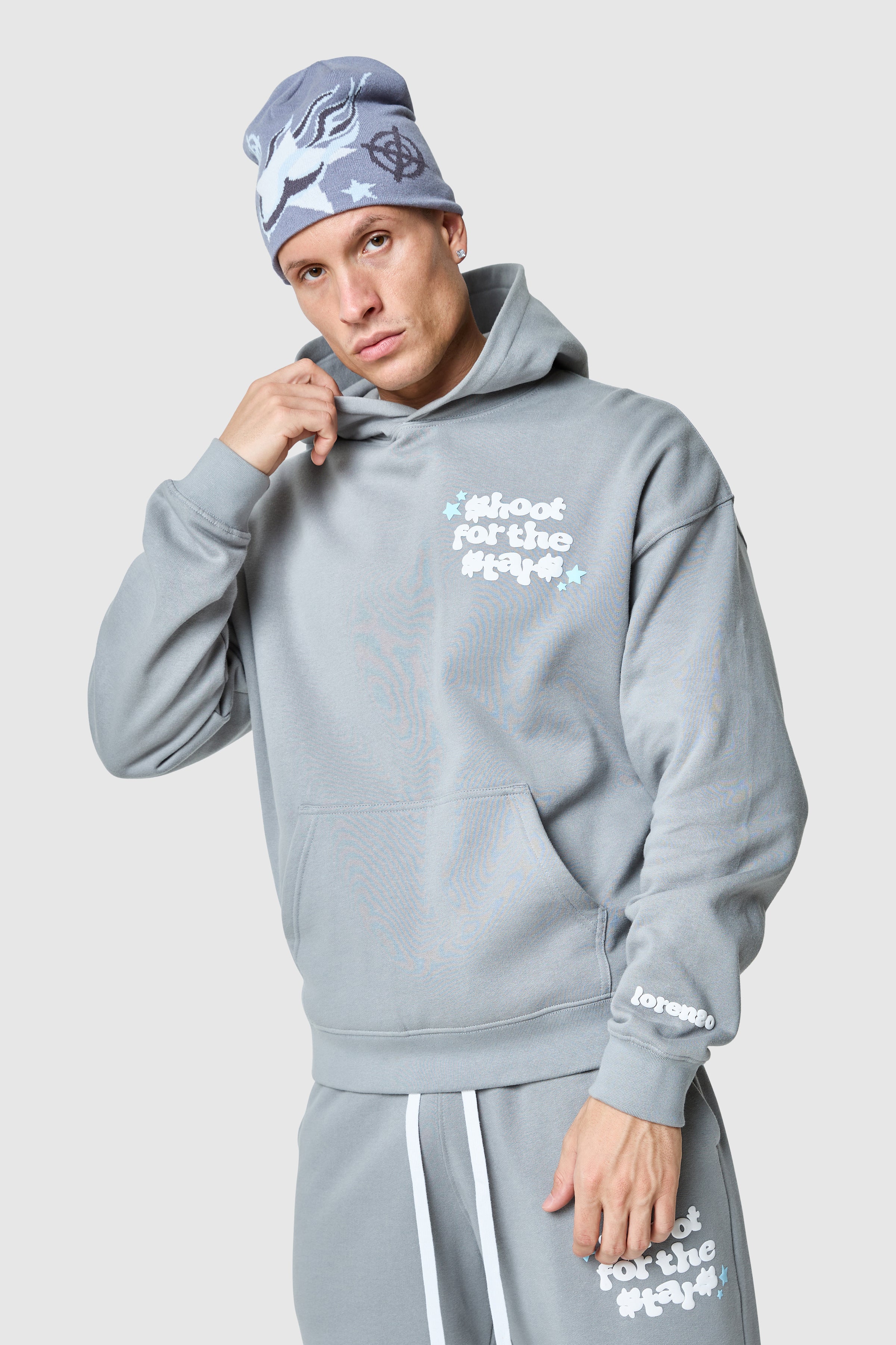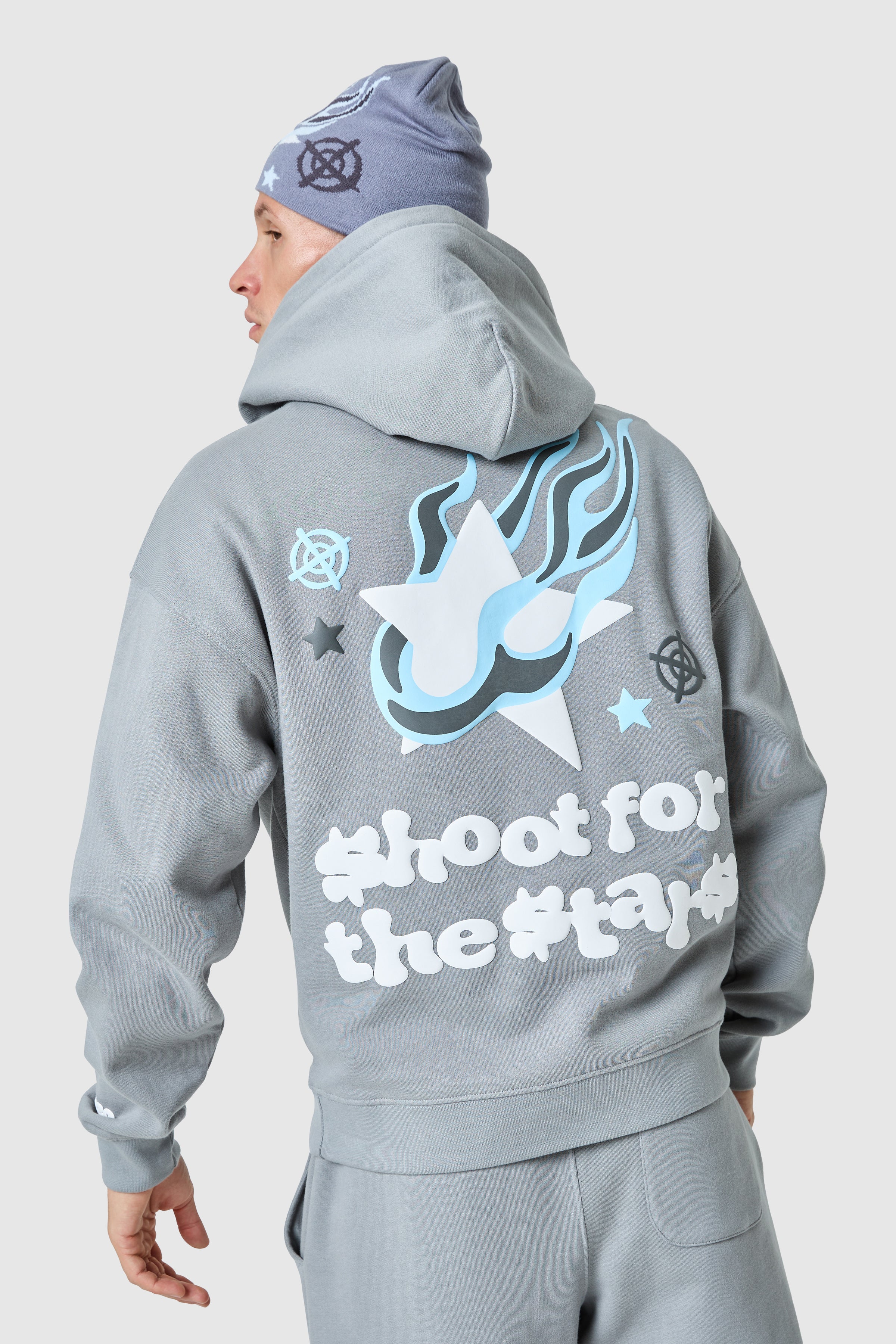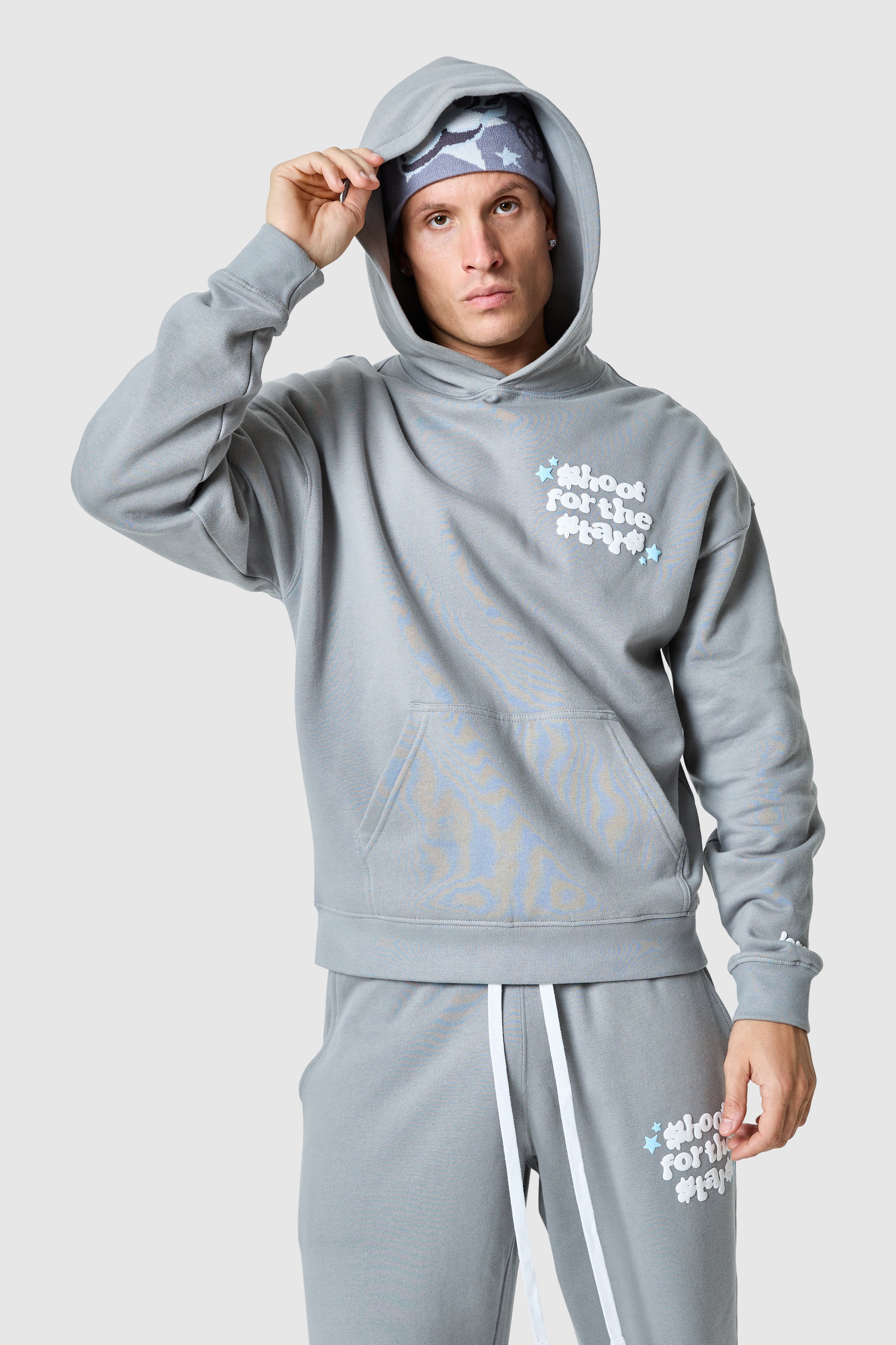 Introducing the Shoot For The Stars Tracksuit. Featuring a bold graphic puff print and ribbed cuffs and hem hood and a wide leg jogger, Shoot for the Stars is a new staple.